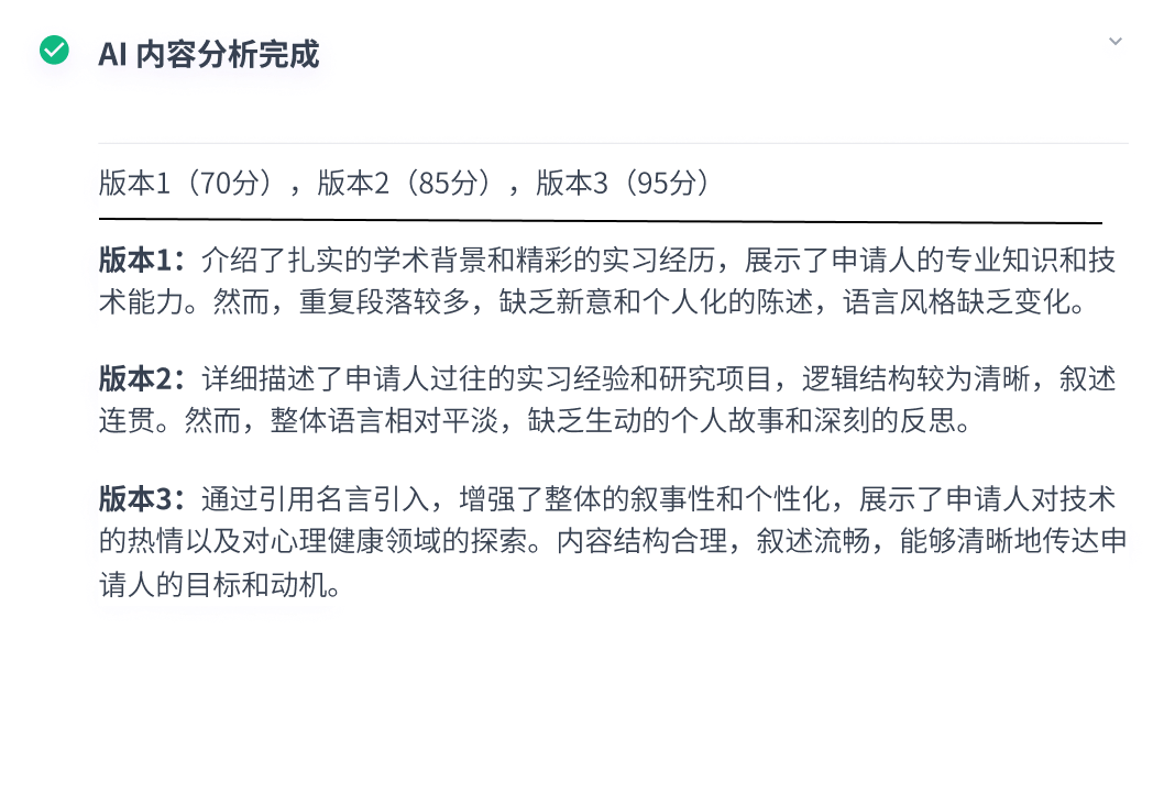 根据学生个人简历和材料,AI定制内容, 保证所有内容都是原创、个性化且无语法错误。 不仅限于模板化创作,让招生官眼前一亮。