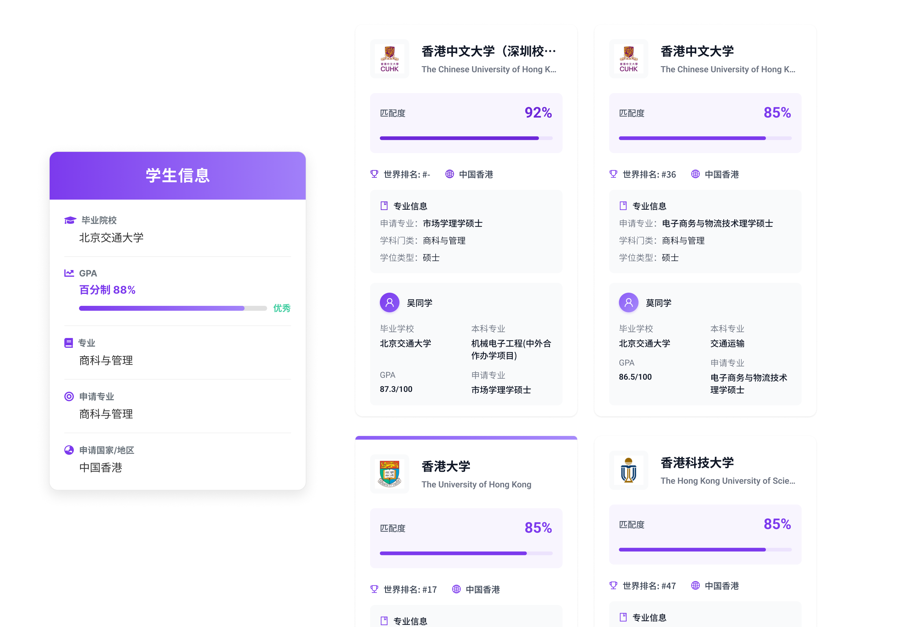 基于千万级学校数据库,精准匹配个性化需求,助力学生找到专属于自己的理想院校,确保留学成功率。